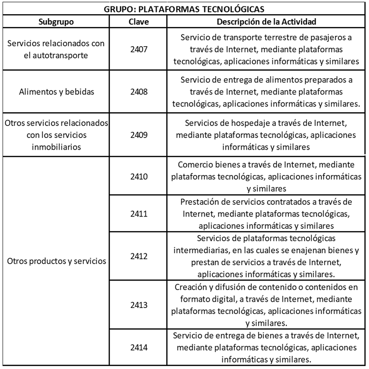 Debemos mencionar que a la fecha de esta publicación aún no se encuentra actualizado el cuestionario de actividades económicas del SAT por lo que recomendamos verificar esta situación antes de proceder a realizar el trámite de inscripción o actualización de actividades de las personas físicas que se ubiquen en los supuestos de enajenación de bienes, prestación de servicios o concesión de hospedaje a través de plataformas tecnológicas.